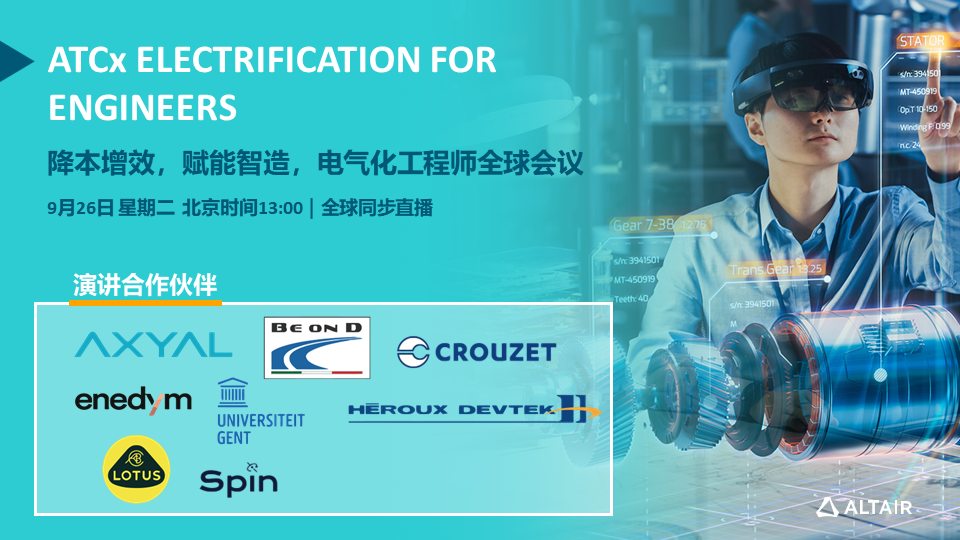 2023年09月26日,Altair 將在全球舉辦 ATCx Electrification for Engineers 即電氣化工程師大會。本次會議將邀請到 Lotus路特斯、AXYAL、CROUZET高諾斯等全球知名制造企業的科技專家和知名高校的學者一起,與 Altair 的電氣化解決方案專家們一同探討如何打破行業的壁壘,實現電氣化技術的創新發展和應用,同時探討如何利用人工智能技術助力電氣化的發展等前瞻性話題。